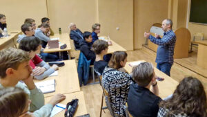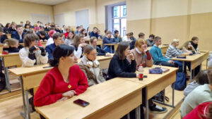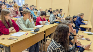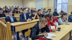 Основная часть лекции была посвящена знакомству школьников с таким направлением астрономической науки, как астрометрия. Ее главная задача – точное определение положения небесных объектов и векторов их скоростей. Простой пример – изучение траектории астероида, сгорающего в атмосфере Земли. Для этого проводится наблюдение этого явления из нескольких точек, расположенных на расстоянии сотен километров друг от друга, а затем решается геометрическая задача об определении, например, координат места падения астероида. Важными и интересными для астрономической науки являются задачи об определении координат значительно более удаленных объектов, например, черных дыр. Обсуждению таких проблем и была в основном посвящена лекция. Для решения практических задач исследования Вселенной астрометристы используют результаты наблюдений из точек, максимально удаленных на нашей планете, изучают объекты из одной обсерватории по мере движения Земли вокруг Солнца, применяют и другие методы.