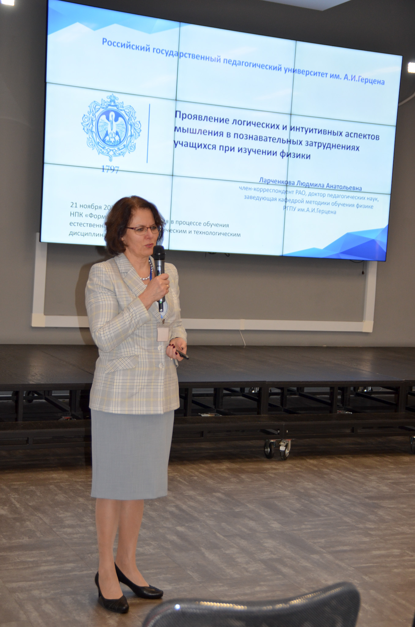 Центральным событием стало пленарное заседание, где с докладом выступила Людмила Анатольевна Ларченкова — заведующий кафедрой методики обучения физике, доктор педагогических наук, член-корреспондент РАО. Её выступление на тему «Проявление логических и интуитивных аспектов мышления в познавательных затруднениях учащихся при изучении физики» задало высокий научный тон всему мероприятию. Людмила Анатольевна подчеркнула, что понимание природы детских ошибок при изучении физики— это ключ к созданию эффективных обучающих методик, которые развивают не только память, но и гибкость ума.