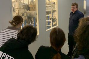 После лекции студенты в сопровождении научного сотрудника лаборатории эпитаксиальных нанотехнологий Константина Котляра побывали в гермозоне университета — комплексе «чистых» комнат с контролируемыми температурой, влажностью и уровнем загрязнения (концентрация пылинок здесь в тысячи раз ниже, чем в обычных помещениях). Студенты ознакомились с уникальным оборудованием для роста полупроводниковых структур и постпроцессинга.